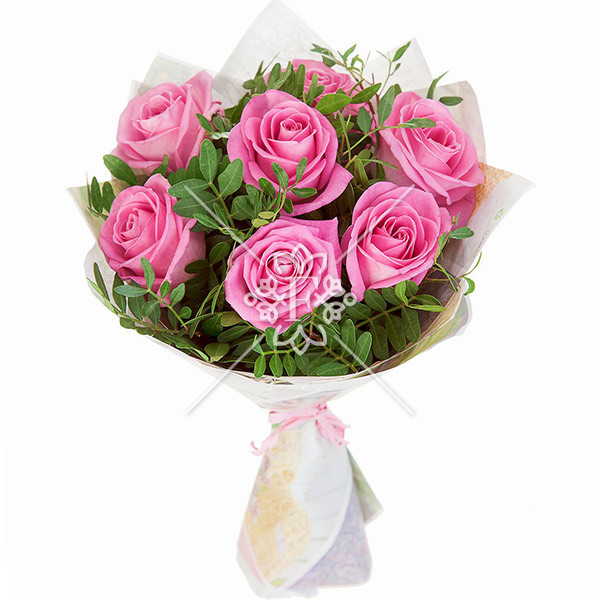Роза розовая - 7 шт., зелень декоративная, упаковка, лента.
